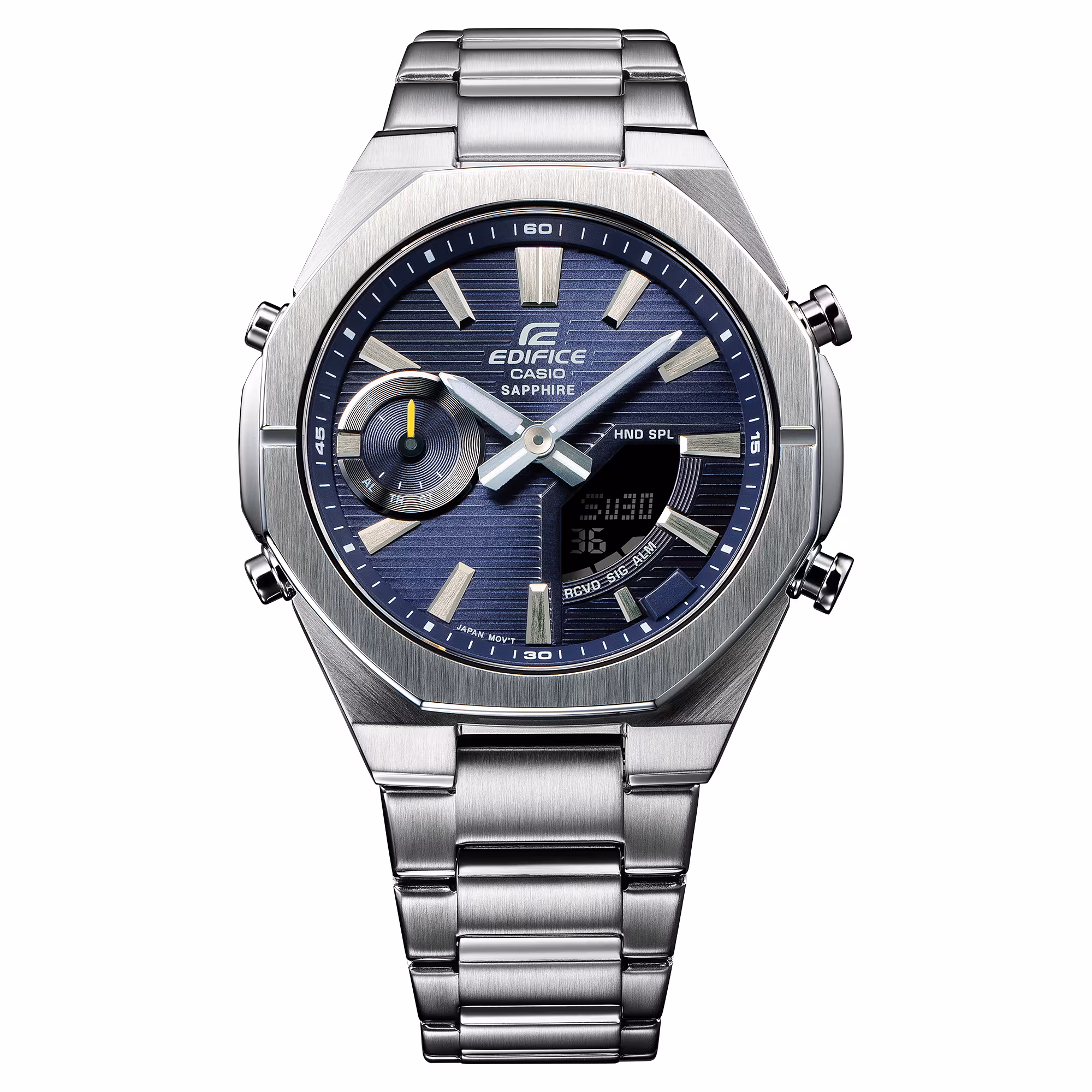 ساعت ECB-S10D-2A با طراحی مدرن و اسپرت خود، مناسب برای استفاده در محیطهای کاری، ورزشی و روزمره است. ترکیب رنگ آبی صفحه با عقربههای نقرهای و زرد، جلوهای جذاب و متمایز به ساعت بخشیده است. ضخامت کم بدنه (9.6 میلیمتر) باعث راحتی در استفاده و عدم گیر کردن در مچ دست میشود.