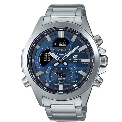 ساعت Casio Edifice ECB-30D-2ADF با طراحی اسپرت و صفحه آبی، دارای قاب و بند استیل ضدزنگ، مقاومت ۱۰۰ متری در برابر آب و اتصال بلوتوث برای تنظیم خودکار زمان است. ترکیب آنالوگ و دیجیتال، ظاهری مدرن و عملکردی دقیق به آن داده است.