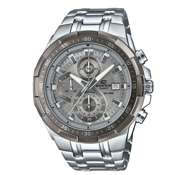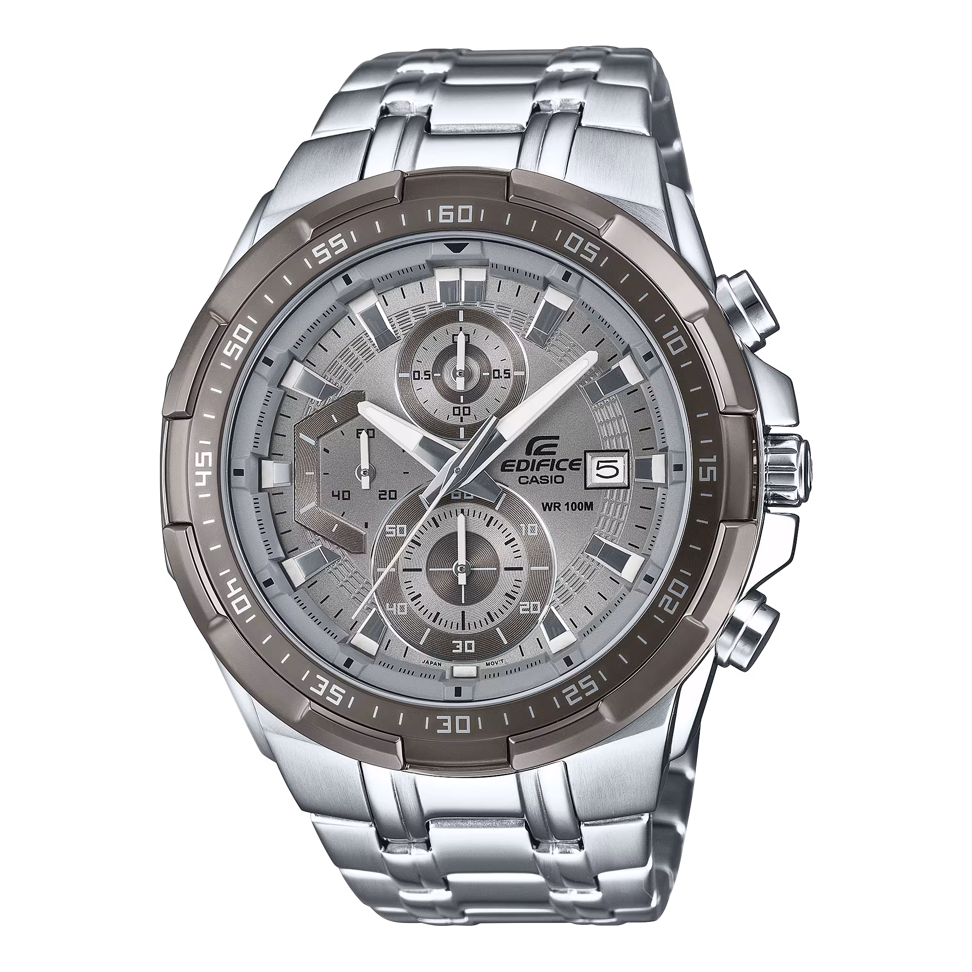 مدل EFR-539DE-8AV با طراحی سهبعدی قاب و صفحه خاکیرنگ، جلوهای مدرن و اسپرت دارد. جزئیات قرمز رنگ در نشانگرهای کرنوگراف، به جذابیت بصری این ساعت افزوده است. بند استیل ضدزنگ با قفل تاشو، علاوه بر استحکام، راحتی در استفاده روزمره را فراهم میکند.